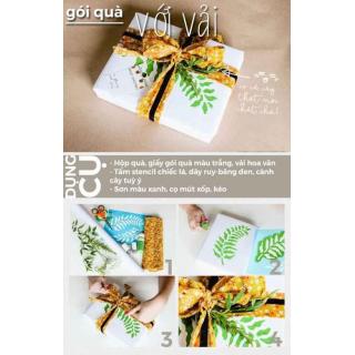 Trước tiên, các bạn gói hộp quà bằng giấy trắng. Chấm màu xanh lên trên tấm stencil chiếc lá, sau đó in hình lên mặt trước gói quà rồi để khô.