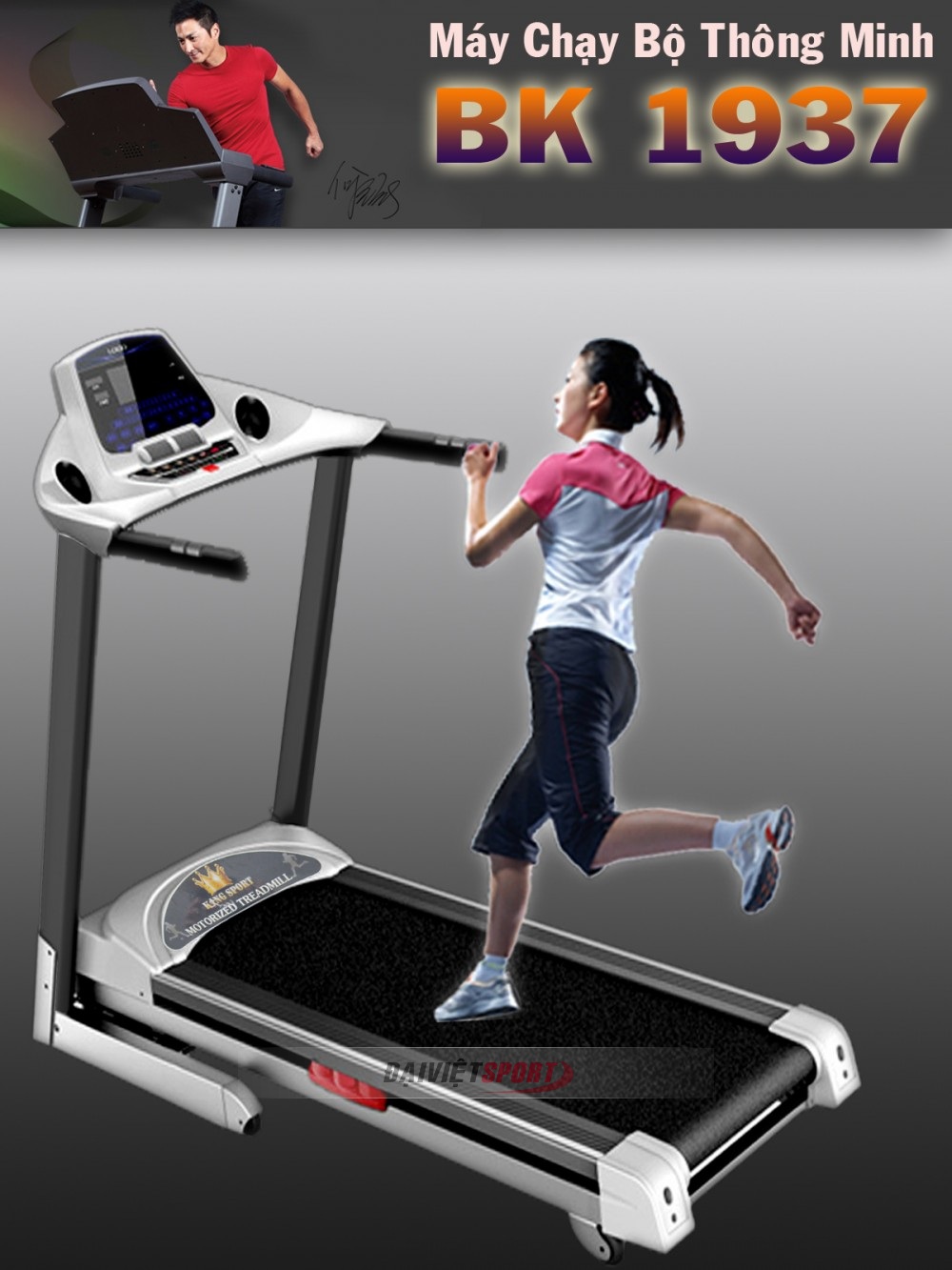 Máy chạy bộ điện đa năng BK-1937 thuộc dòng sản phẩm máy chạy bộ thông minh của King Sport. Máy chạy bộ đa năng BK-1937 với kiểu dáng thể thao mạnh mẽ, thiết kế sang trọng, cá tính và phong cách. Động cơ, bo mạch xử lý thông minh được sản xuất tại Đài Loan, sản xuất trên dây chuyền thiết bị hiện đại hàng đầu tại Mỹ, thiết kê khung sườn được làm từ thép chịu lực chắc chắn, hạn chế độ rung và tiếng ồn khi thực hiện bài tập ở cường độ cao. Cùng với công nghệ sơn tĩnh điện hàng đầu thế giới của Malaysia tạo nên vẻ sang trọng tinh tế đến từng chi tiết. Chương trình luyện tập thông minh được lập trình mặc định, các chương trình chạy khởi động, chạy ngẫu nhiên, chạy thi đấu, chạy vượt đồi, chạy leo núi, chạy giảm cân, chạy vượt mục tiêu thời gian, chạy vượt mục tiêu khoảng cách, chạy vượt mục tiêu năng lượng tiêu hao, chế độ luyện tập thể lực, chế độ luyện tập tăng cường sinh lý… Đặc biệt bạn có thể lựa chọn chế độ luyện tập cho riêng mình bằng cách nhập các thông số: chiều cao, cân nặng, tuổi tác, giới tính. Hệ thống xử lý thông minh tự động đưa ra các bài tập phù hợp mang tính hiệu quả cao.
