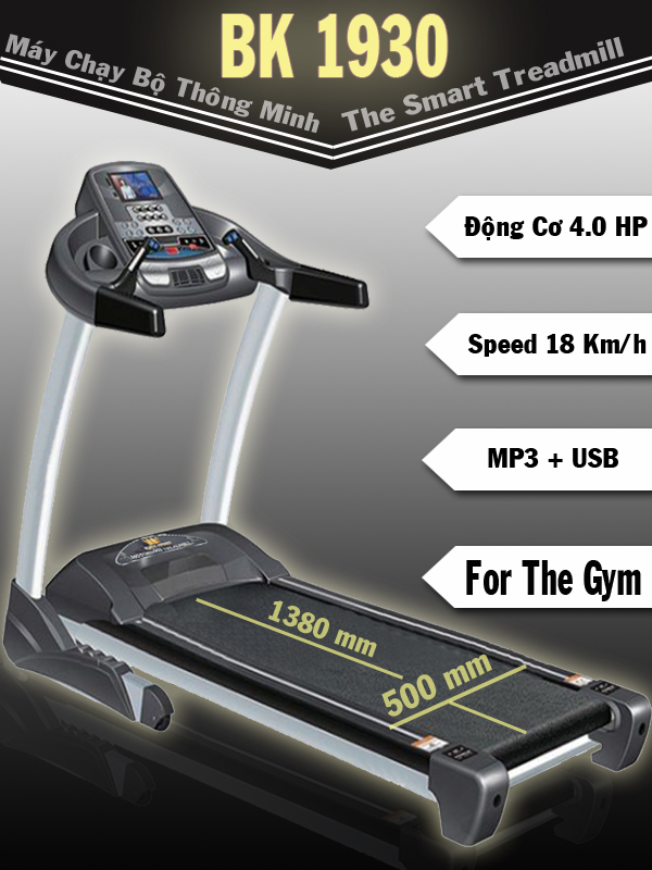 - Máy chạy bộ điện đa năng BK-1930 thuộc dòng sản phẩm máy chạy bộ thông minh của King Sport. Máy chạy bộ điện đa năng BK-1930 với vóc dáng thể thao mạnh mẽ, sang trọng và tinh tế. Động cơ, bo mạch xử lý thông minh được sản xuất tại Đài Loan, sản xuất trên dây chuyền thiết bị hiện đại hàng đầu tại Mỹ, thiết kê khung sườn được làm từ thép chịu lực chắc chắn, hạn chế độ rung và tiếng ồn khi thực hiện bài tập ở cường độ cao. Cùng với công nghệ sơn tĩnh điện hàng đầu thế giới của Malaysia tạo nên vẻ sang trọng tinh tế đến từng chi tiết. Chương trình luyện tập thông minh được lập trình mặc định, các chương trình chạy khởi động, chạy ngẫu nhiên, chạy thi đấu, chạy vượt đồi, chạy leo núi, chạy giảm cân, chạy vượt mục tiêu thời gian, chạy vượt mục tiêu khoảng cách, chạy vượt mục tiêu năng lượng tiêu hao, chế độ luyện tập thể lực, chế độ luyện tập tăng cường sinh lý… Đặc biệt bạn có thể lựa chọn chế độ luyện tập cho riêng mình bằng cách nhập các thông số: chiều cao, cân nặng, tuổi tác, giới tính. Hệ thống xử lý thông minh tự động đưa ra các bài tập phù hợp mang tính hiệu quả cao.